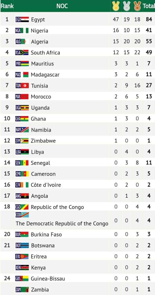 Nigeria is currently ranked second on the medals table with a total of 41 medals (16 Gold, 10 Silver, and 15 Bronze) from five disciplines at the ongoing 13th African Games in Accra Ghana.